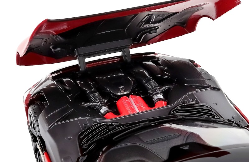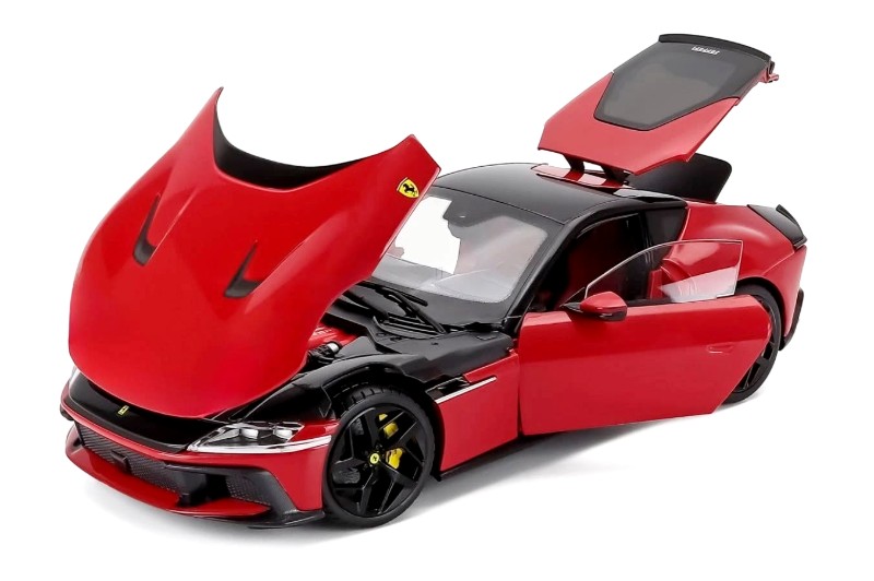 Construită din metal (die-cast), macheta oferă durabilitate și un nivel bun de detaliu, fiind ideală pentru colecționari și pasionații de modele Ferrari moderne.