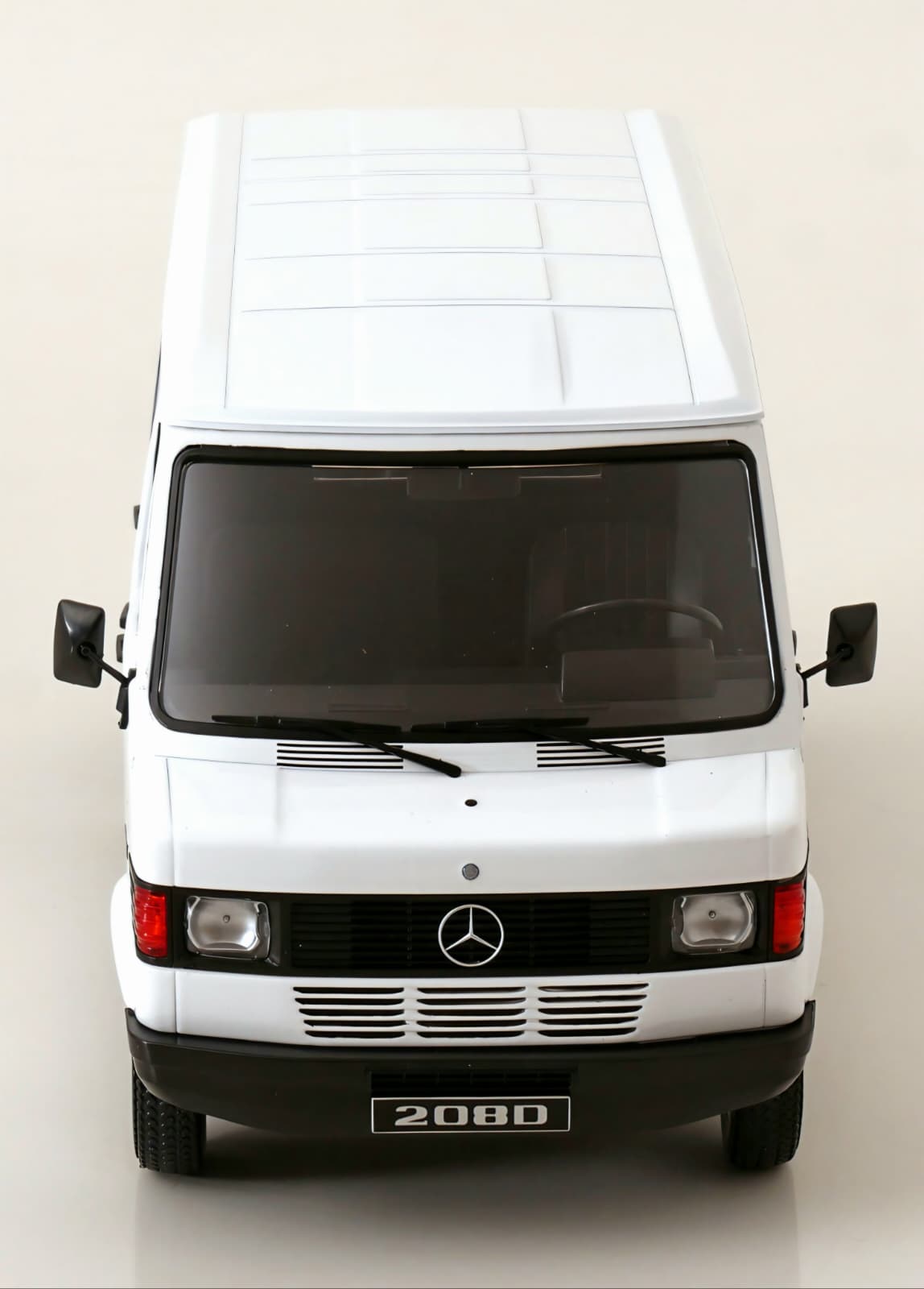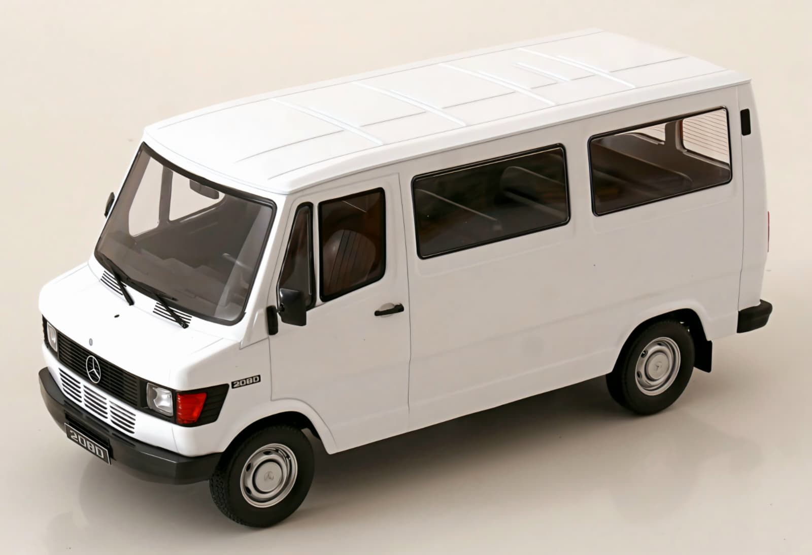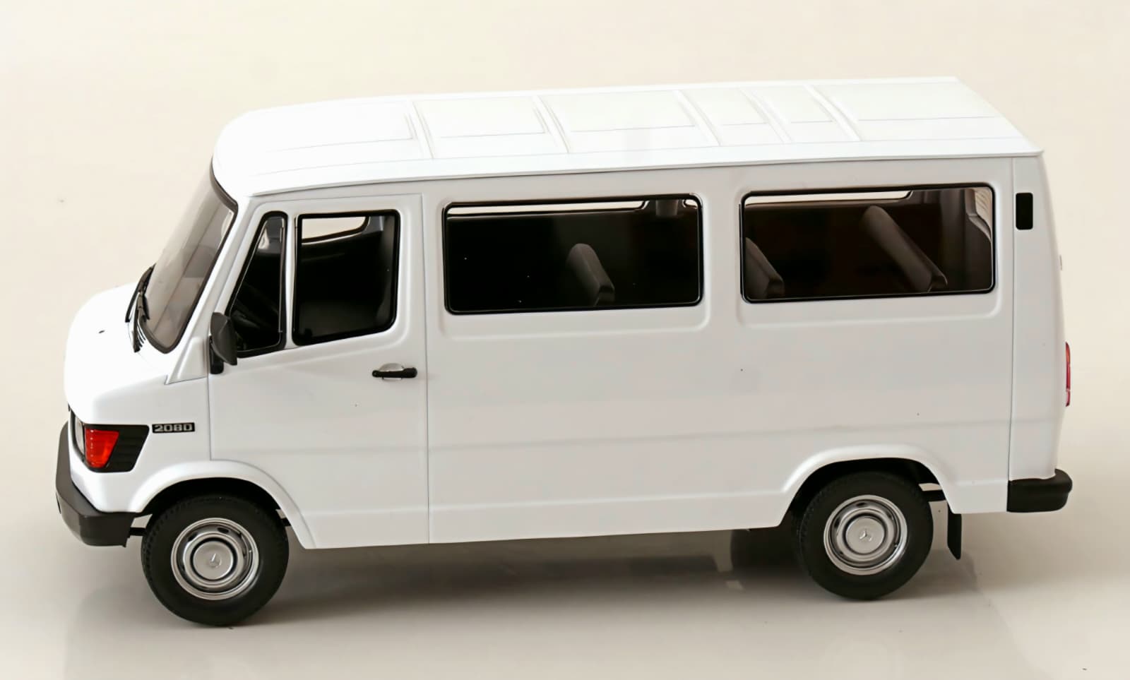 Macheta Mercedes-Benz 208 D Transporter Bus 1:18 KK Scale – Alb metalizat este o replică fidelă a versiunii bus a celebrului transporter Mercedes, apreciată pentru designul clasic și utilitatea sa multifuncțională. Modelul se remarcă prin finisaje curate și proporții corecte, fiind dedicat colecționarilor de vehicule utilitare și machete Mercedes-Benz de epocă.