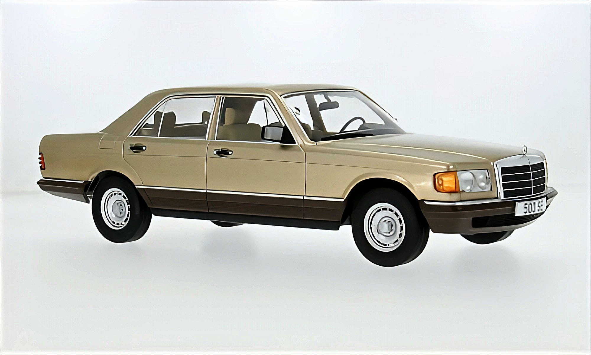 Macheta Mercedes-Benz S-Klasse (W126) 1:18 MCG (Model Car Group), reproduce una dintre cele mai iconice limuzine de lux din istoria Mercedes-Benz. Modelul impresionează prin designul clasic, proporțiile elegante și finisajul deosebit în nuanță beige, care evidențiază rafinamentul specific generației W126. Construită din metal (die-cast) în versiune sealed (fără elemente mobile), macheta oferă un aspect realist și o execuție de calitate, fiind ideală pentru colecționari.