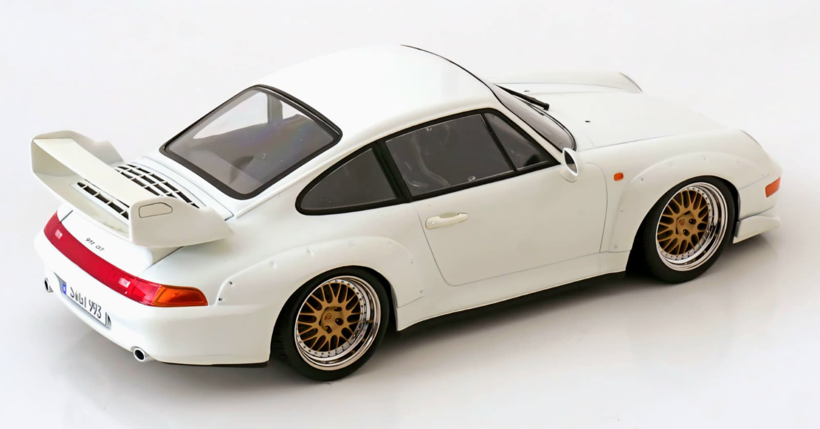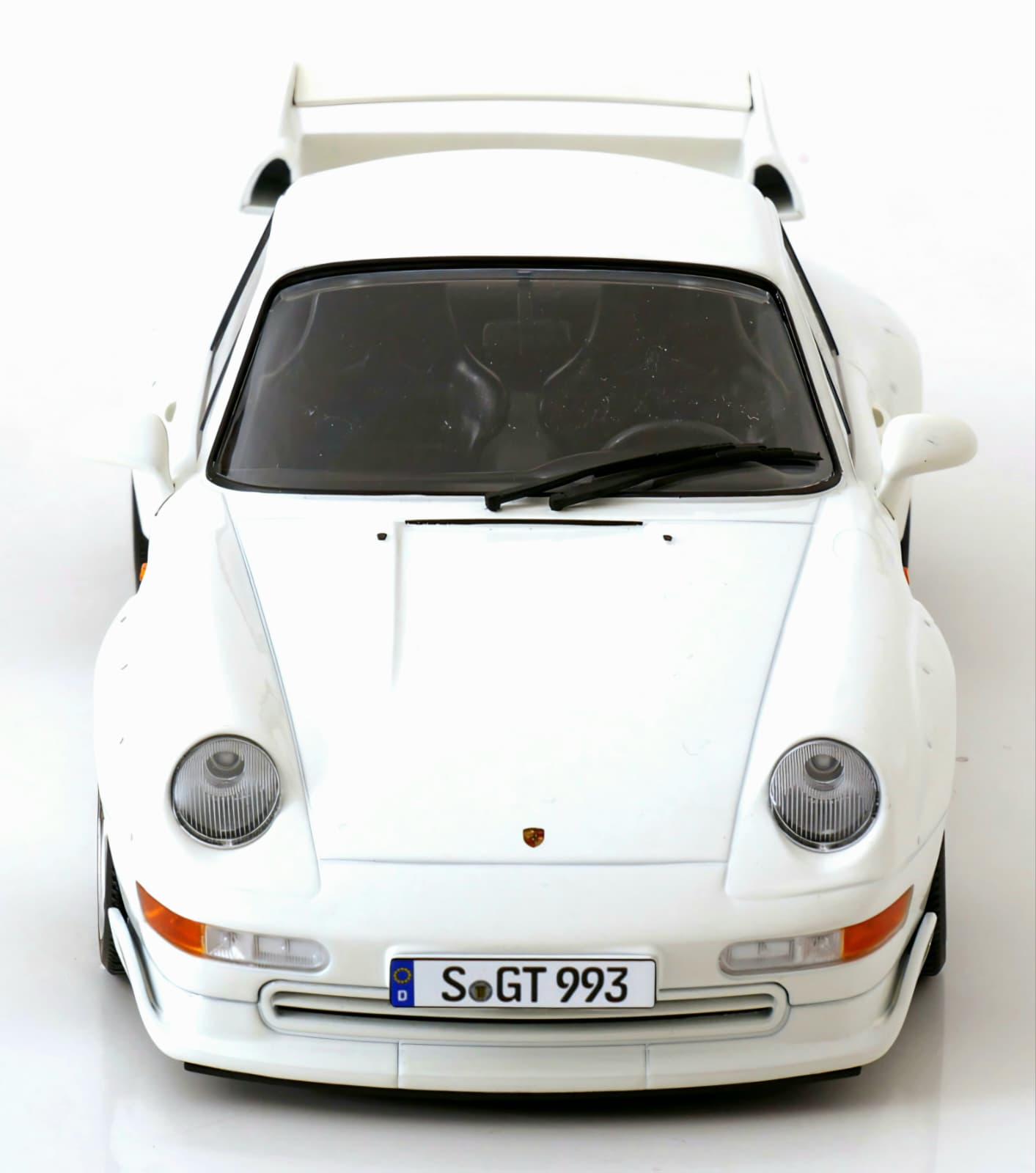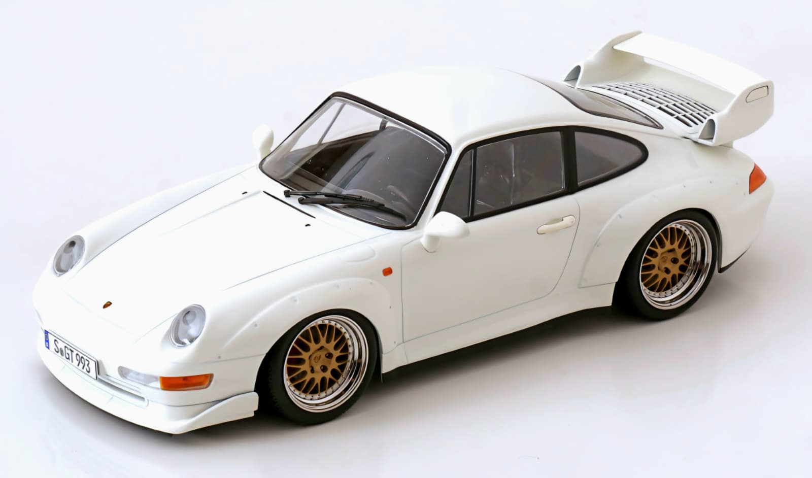 Macheta Porsche 911 (993) GT2 1:18 KK Scale, reproduce una dintre cele mai radicale și rare versiuni ale generației 993, dezvoltată pentru performanță extremă și motorsport. Modelul impresionează prin designul agresiv, aripile evazate, eleronul distinctiv și detaliile specifice versiunii GT2. Finisajul in culoarea alb este completat de jantele BBS, oferind un aspect autentic și sportiv. Construcția die-cast asigură durabilitate și un nivel bun de detaliu.