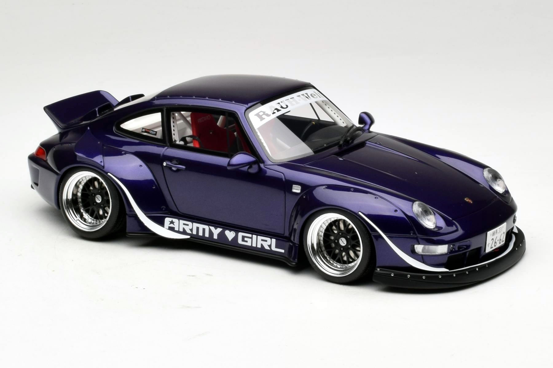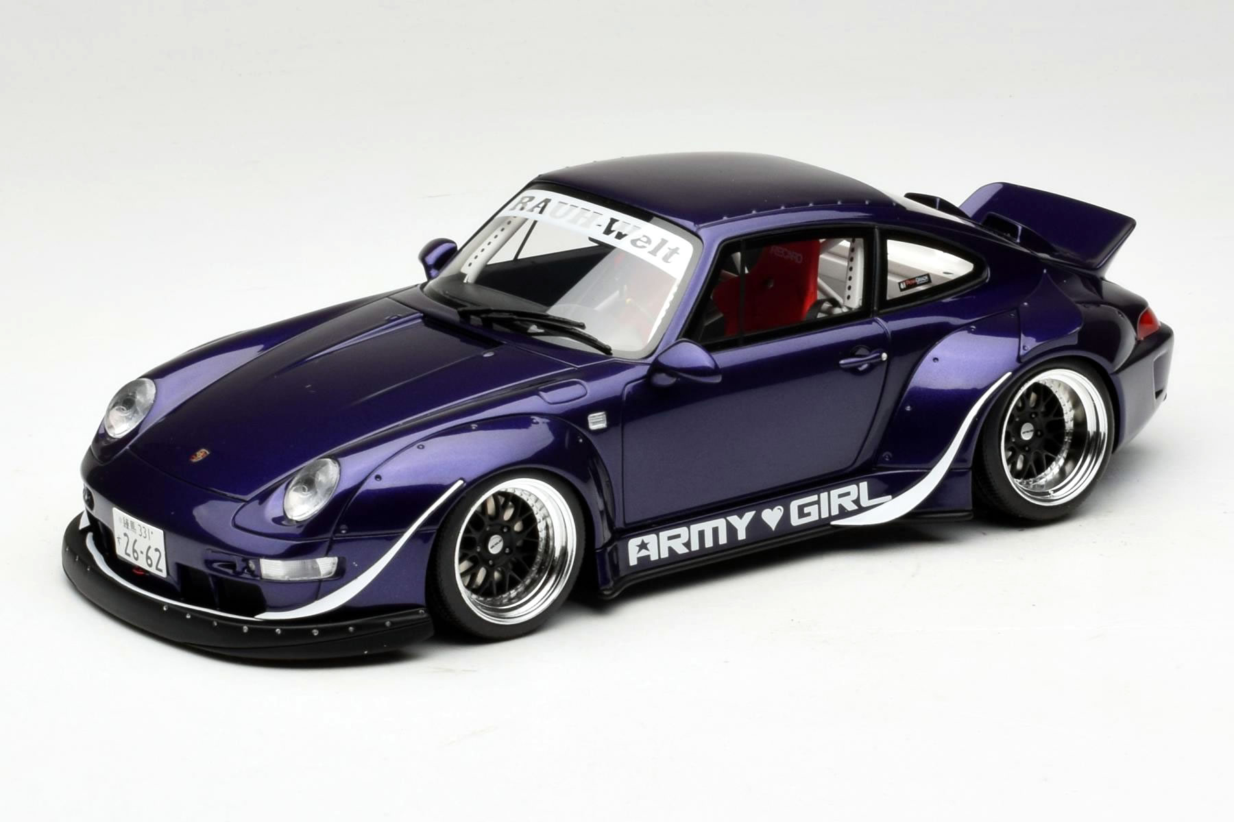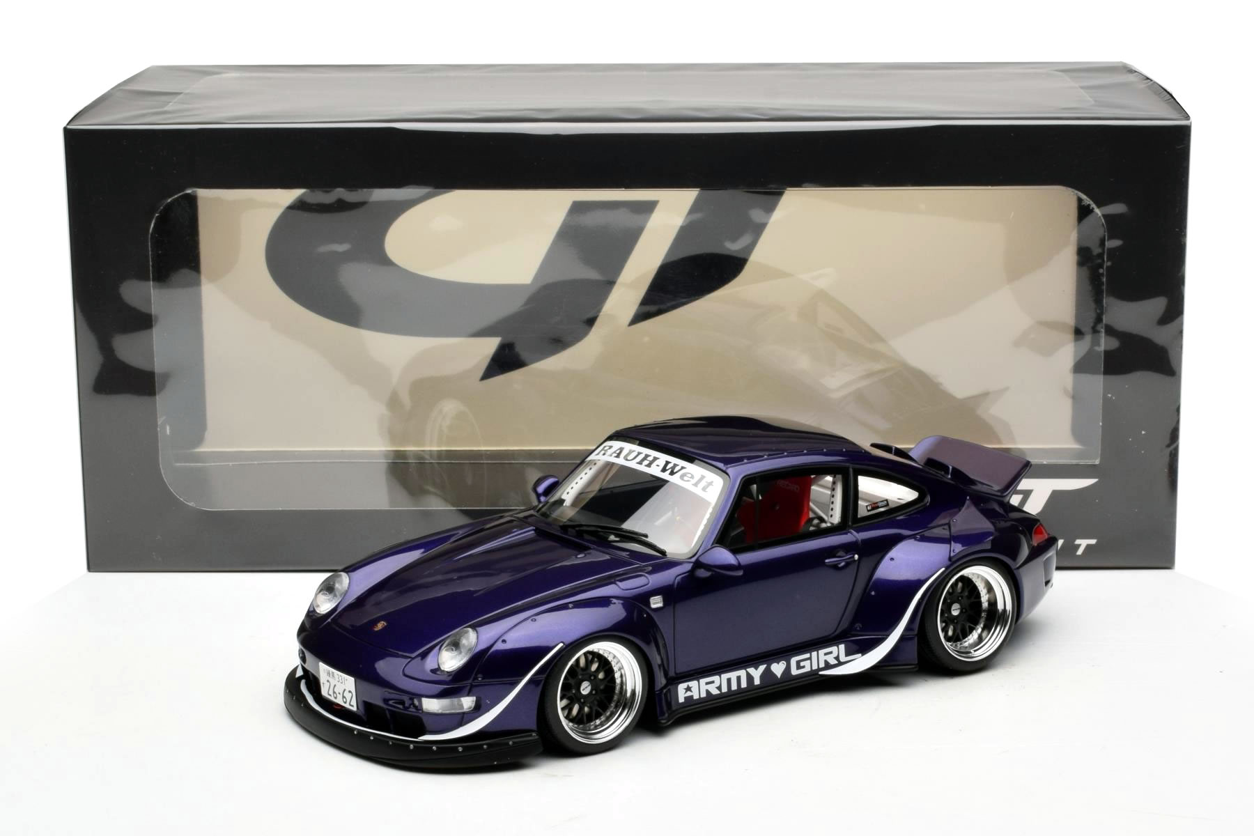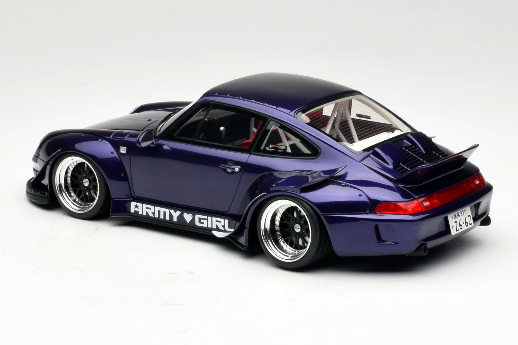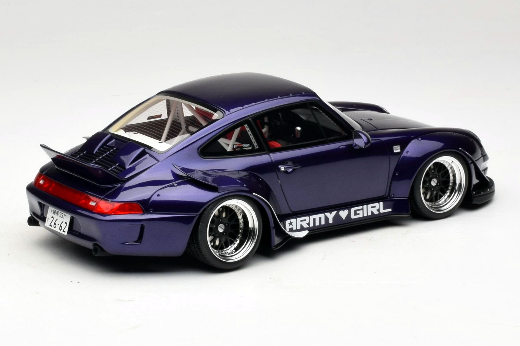 Macheta Porsche 911 RWB „Army Girl” Mov 1:18 GT Spirit (GT562), reproduce celebrul model modificat de Rauh-Welt Begriff (RWB), cunoscut pentru kiturile widebody extreme și stilul inconfundabil. Această versiune specială se remarcă prin grafica distinctivă “Army Girl” și finisajul spectaculos în culoarea Purple, care oferă un aspect agresiv și exclusivist. Construită din rășină (resin), macheta oferă un nivel ridicat de detaliu și fidelitate, fiind o piesă premium pentru colecționari.